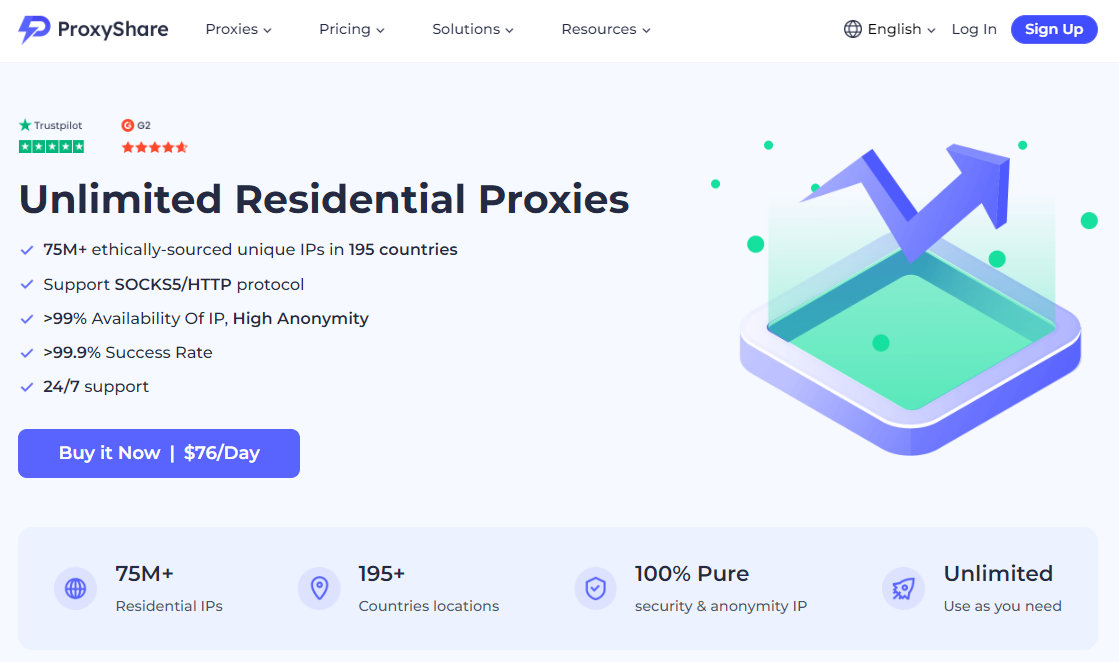 First, ProxyShare boasts over 75 million ethically-sourced residential proxies spread across more than 195 locations worldwide. These proxy IPs offer 100% purity, ensuring high-level security and anonymity, which makes it difficult for target websites to detect and block scraping activities and thereby increase the success rate.